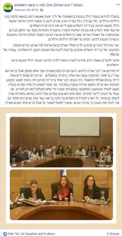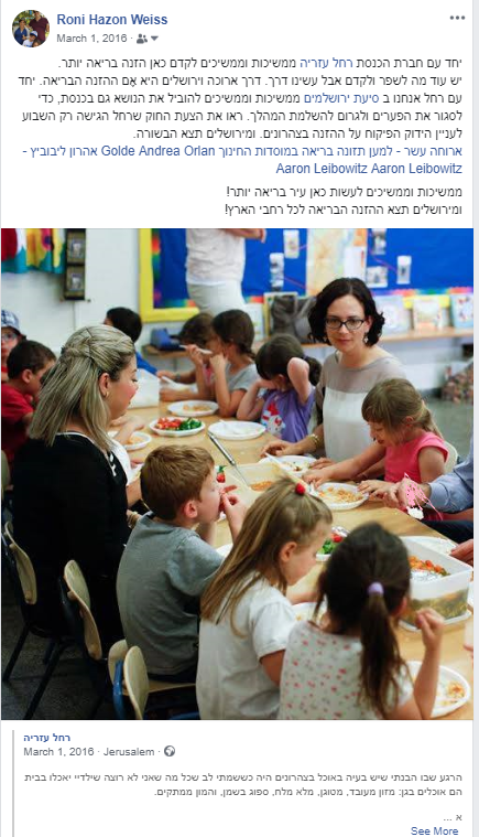 ברוכה הבאה להצצה לשינוי החברתי שלי בתחום הזנת ילדים במוסדות חינוך. צוות ההורים "ארוחה עשר למען תזונה בריאה במוסדות חינוך" (אותו הובלתי) בשיתוף הדוק עם רחל עזריה, בתפקידה כסגנית ראש עיריית ירושלים, ואחריה עם מחליפה בתפקיד, הרב אהרון ליבוביץ, הצליח לשנות את תפריט ארוחת הצהריים (הזנה) בגנים ובצהרונים בירושלים לתפריט בריא. למהלך היו שותפים גם משרד החינוך ומפעל ההזנה הארצי.